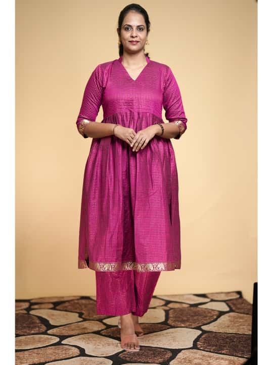 🌸 Zari Checks Silk Cotton Kurthi Set with Grand Border - Pink - SAK241