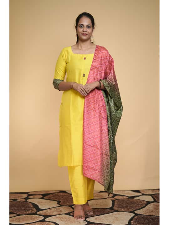 ✨ Yellow Raw Silk Kurthi Set with Bandhini Touch – Boutique Masterpiece ✨SAK255