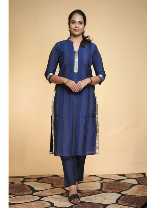 🌸 Silk Cotton Kurthi Set with Zari Border - Navy Blue - SAK239
