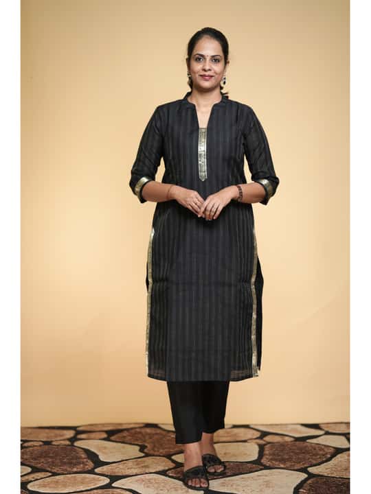 🌸 Silk Cotton Kurthi Set with Zari Border - Black - SAK238